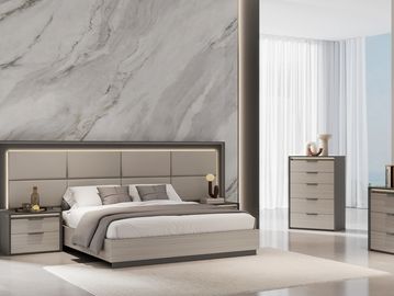 The Porto premium bedroom features an elegant design beautifully mixing a natural light grey lacquer finish which looks striking against the natural wenge wood veneer. The headboard shows off uniquely carved diagonal lines which look spectacular when the built in LED lights featuring a dimmer function are on. The interplay of wenge with light grey.