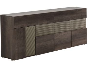 Add shine and glamour to your home with our four door credenza finished in a stunning silvery Elsinore Champagne, and with mirrored surfaces and beaded trim accents.